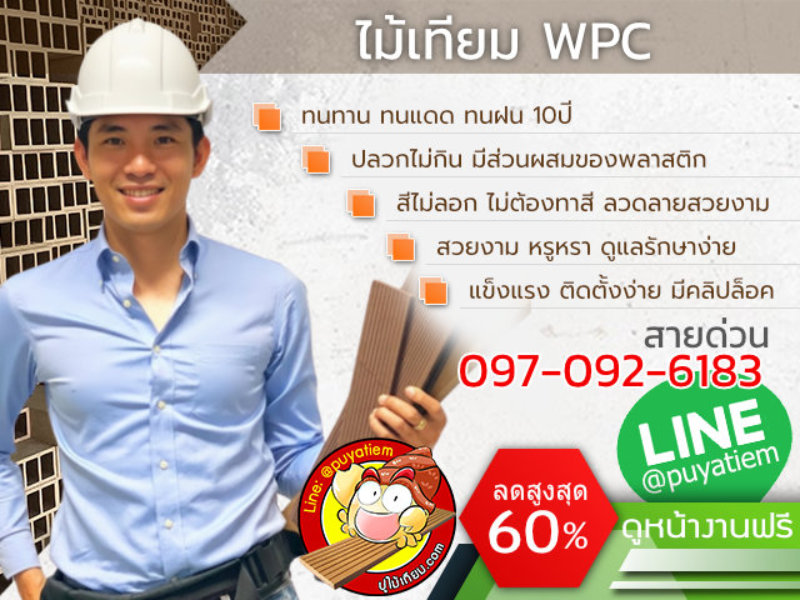 ไม้เทียม WPC (Wood Plastic Composite) คือไม้เทียมที่ผลิตโดยใช้วัสดุจากไม้ผสมกับพลาสติก ลักษณะเด่นของไม้เทียมชนิดนี้คือมีความยืดหยุ่นแข็งแรงแบบเดียวกับไม้จริง ใช้ได้ทั้งภายนอกและภายในอาคาร สามารถรองรับน้ำหนักได้ดี จึงเหมาะที่จะนำมาใช้งานได้แทบจะทุกรูปแบบตั้งแต่ ปูพื้น ติดฝ้า รั้ว ทำระแนงบังตา ตกแต่งอาคาร เป็นต้น